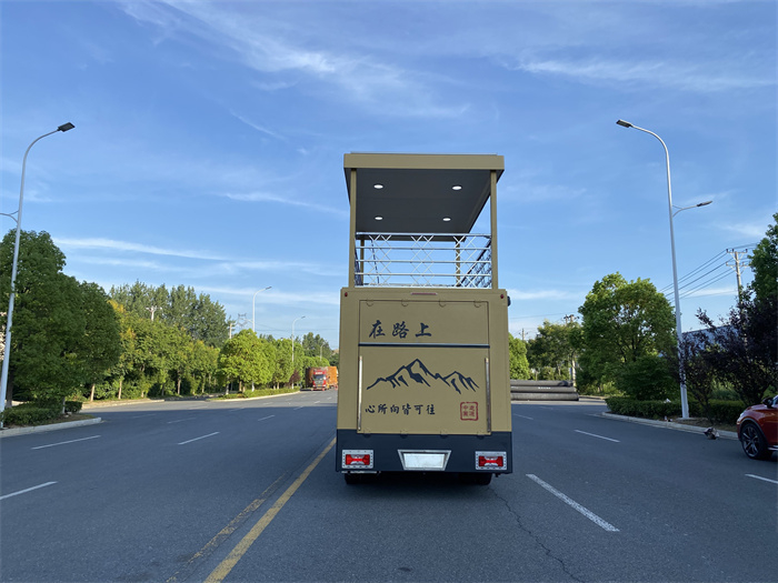 車身采用沙漠黃的顏色搭配黑色字母和駱駝圖案,讓人眼前一亮。車身右側配有4米遮陽棚,二級電動踏板,外置抽拉花灑,超大儲物艙。