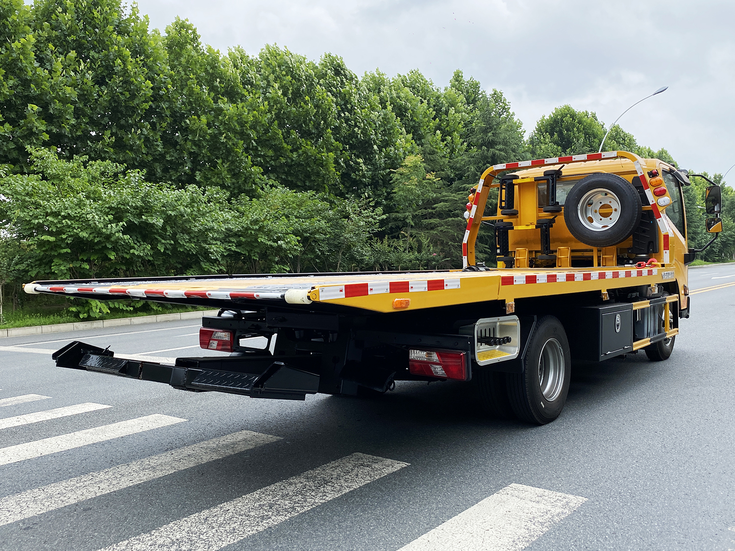 上裝配置:藍牌沖壓平板一體板,板長5350,帶一個活動尾板;雙側聯動操作裝置,后工作燈三只,1個40KN絞盤(配25米鋼絲繩),1個工具箱,配2個小車,1對L型抱胎架,4根插綁帶,1對托叉及托叉座,1條鏈鉤,配2噸后托臂。
