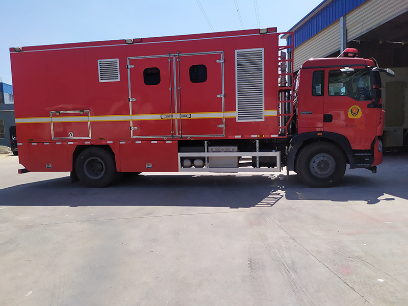 4) 安全措施。車(chē)廂內(nèi)門(mén)口處配有消防滅火器, 車(chē)廂內(nèi)配有煙感報(bào)**器、交直流防爆照明燈和應(yīng)急燈, 還有方便使用的接地釬和接地線, 以有效保證電源車(chē)的安全。選用智能滅火系統(tǒng),可無(wú)人值守。