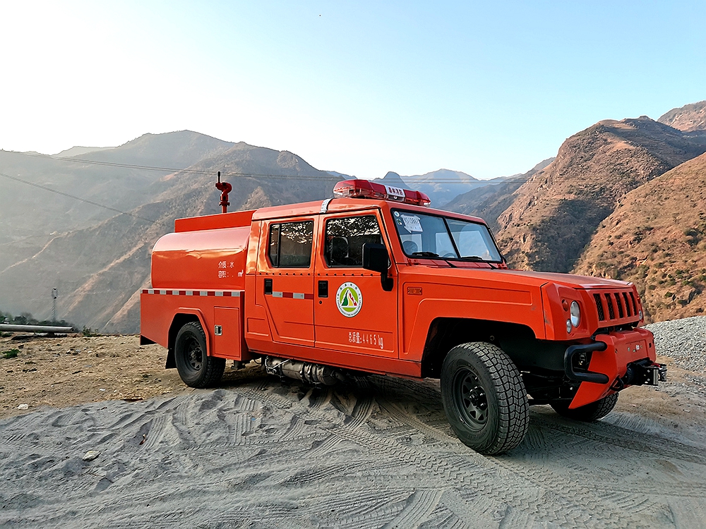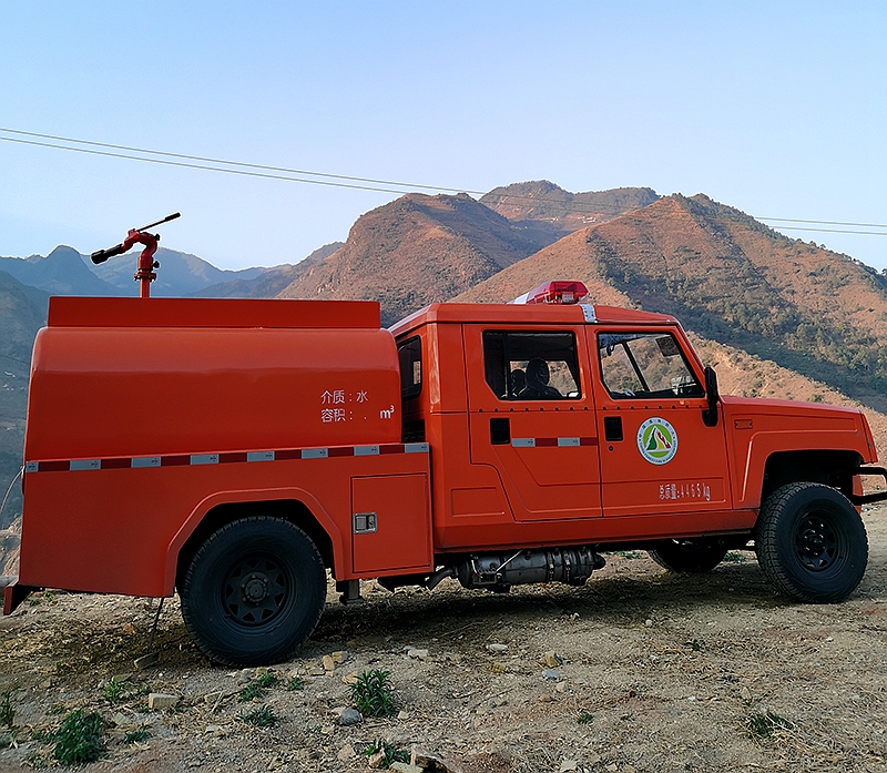 上裝配置:罐體采用武鋼QB235板材4mm、罐體容積1.92立方,實際容積2立方,安裝取力器,65QZ40/50型水泵,射程可達30米,頂置水炮,選裝前沖后灑,后置對開門**箱。