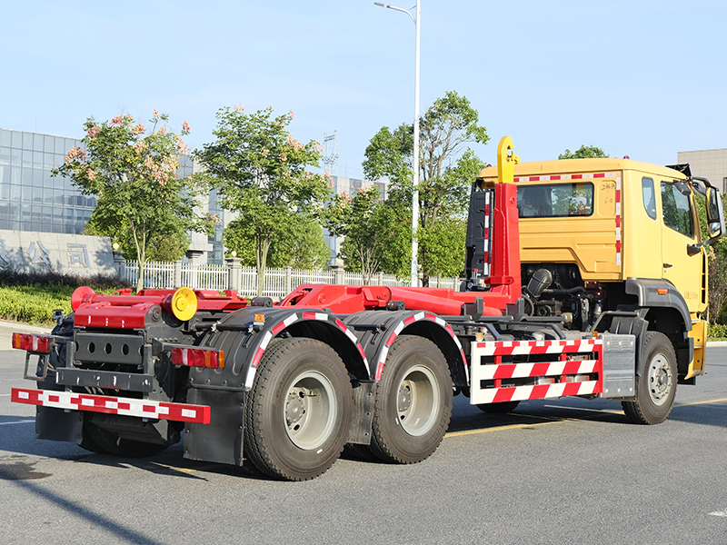 該車可將地下垃圾箱內(nèi)的垃圾及垃圾箱一同拉車上運(yùn)走同時(shí)可自卸,降低了工人的勞動(dòng)強(qiáng)度。該垃圾車的收運(yùn)方式是目前世界上廣泛采用的垃圾收運(yùn)方式,可以實(shí)現(xiàn)一車多箱,大大降低了配備成本和空間等等;其專用裝置的功能均以汽車發(fā)動(dòng)機(jī)為動(dòng)力,通過液壓機(jī)構(gòu)手動(dòng)或電控來實(shí)現(xiàn)。車輛的箱體采用優(yōu)質(zhì)炭鋼板全密封焊接結(jié)構(gòu),具有強(qiáng)度高、重量輕、不產(chǎn)生二次污染等優(yōu)點(diǎn)。